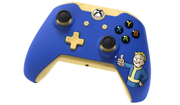 The controller sports a very nice blue and gold colour scheme. Also a picture of a vault boy on the right side. The D-Pad has insignias. There also happens to be a button tucked next to the right analog stick. There are discussions on whether this is an official Microsoft controller or a third party one. For one, the headset adapter is now missing and has been replaced with a headphone jack. Secondly, the insignias on the D-Pad look to be audio settings. The left button could be for game audio, the right button is the same as the party and friends symbol on the dashboard and the up and down are for volume control. The button next to the right analog stick could be a mute button. Finally, this controller is apparently wired.